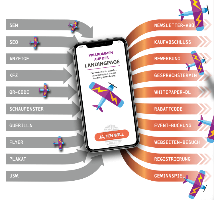 Die Landingpage ist eigentlich schon der zweite Schritt in Ihrem Marketingtrichter. Ausgangspunkt für die „Landung“ ist eine aufmerksamkeitsstarke Werbemaßnahme, die den Besucher direkt abholt. Das kann – je nach Produkt und Budget – eine klassische Printanzeige sein, eine GoogleAd, eine Buswerbung oder auch eine Guerilla-Strategie. All diese Instrumente haben das Ziel, den Betrachter zum Besuch der Landingpage zu bewegen. Dort wird er mit weiteren Informationen versorgt, und es wird vor allem noch mehr Lust auf das beworbene Angebot gemacht. Schließlich soll der Besucher mit Hilfe einer entsprechenden Handlungsaufforderung (CTA = Call to action) dazu gebracht werden, ein Produkt in Ihrem Onlineshop zu kaufen, Ihren Newsletter zu abonnieren, einen Rabatt-Gutschein für Ihr Ladenlokal herunterzuladen oder Ihnen eine Bewerbung zu schicken. Die Ziele können also ganz unterschiedliche sein.